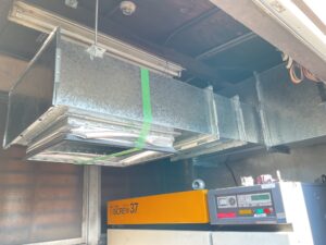 更新機に合わせて採寸したダクトを取付し、油まみれの床面を清掃してから搬入作業に入りました。
