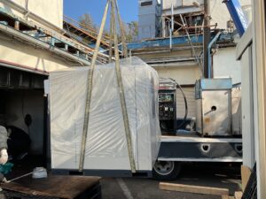 コンプレッサー室の間口もそれほど余裕がある大きさではない為、慎重に作業を進め、所定の位置に設置。
