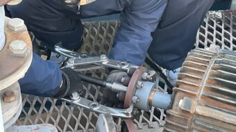 1日目でケレン作業がほぼ終了したので2日目は底面のケレン作業と防錆補強塗料の下塗りを全体に行いました。途中でまったく別の場所から水漏れが起きていることが発覚し、お客様に急遽溶接での補修を行っていただきました。